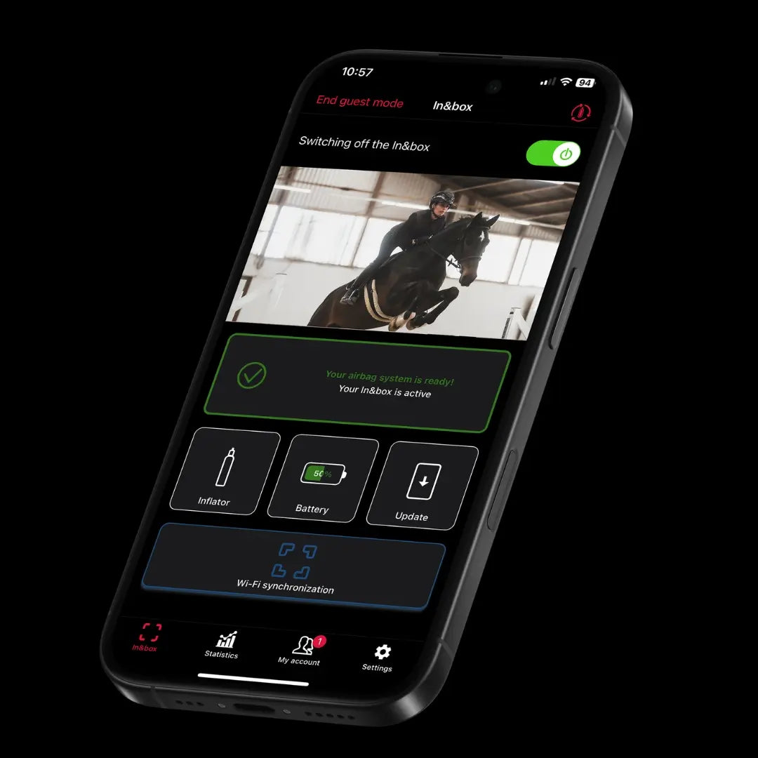 Die Handy-App „My In&box“ ist ein praktisches Echtzeit-Dashboard für Ihr Airbag-System beim Reiten. Über Bluetooth mit der In&Box-Technologie verbunden, ermöglicht die App die Fernaktivierung Ihres Airbags und liefert wichtige Informationen: Batteriestand der In&box, aktivierter Modus, durchzuführende Updates. Mit dieser Anwendung haben Sie die volle Kontrolle über Ihre Ausrüstung und gewährleisten so eine individuelle und skalierbare Sicherheit für jede Reitsession.