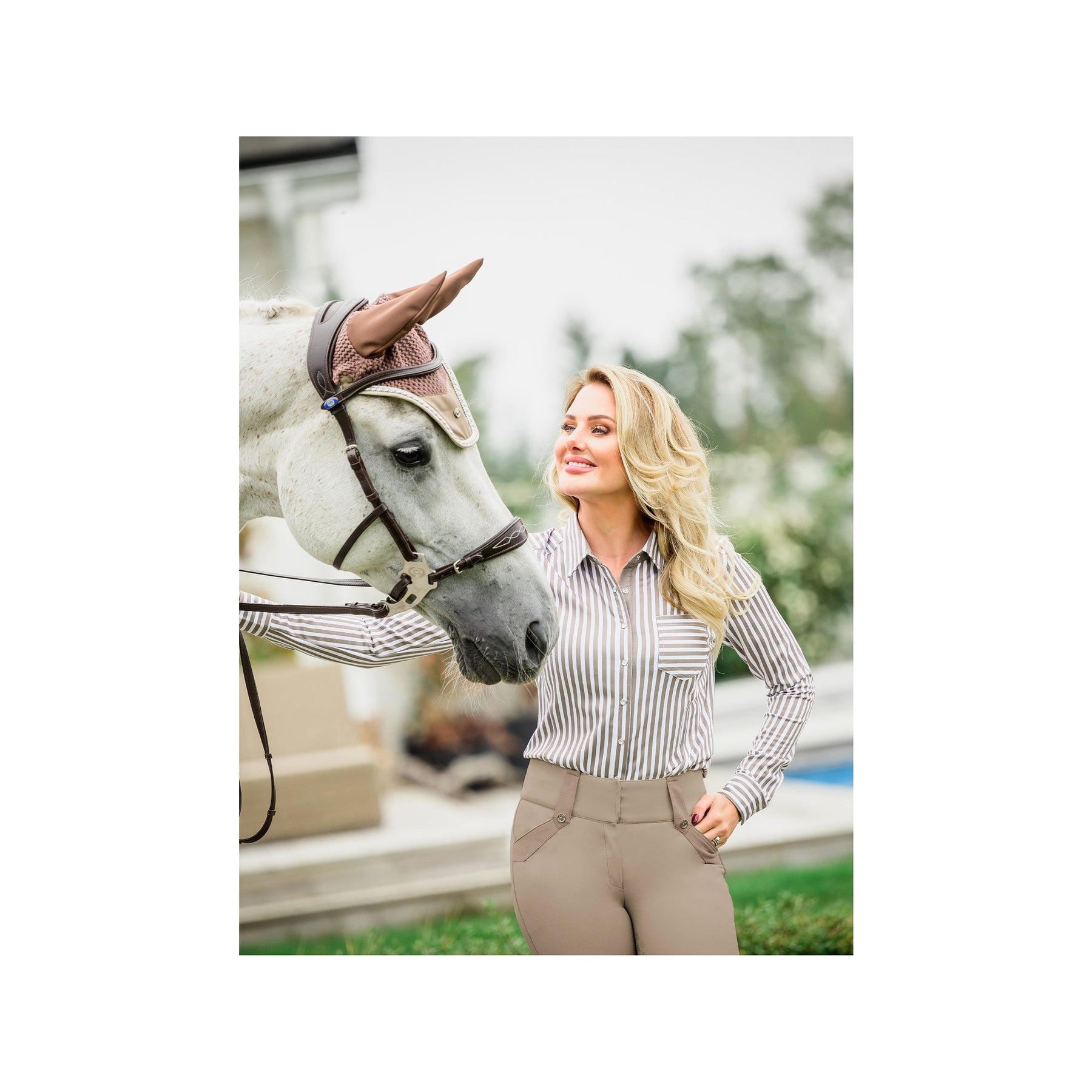 " Bei der Gestaltung von Karen haben wir uns direkt vom Fußweg inspirieren lassen und eine Reithose entworfen, die eine klassische Passform hat, aber mit einer kleinen "Kante" im Design - in Form von Details an den Taschen und Schlaufen. Etwas, worauf wir bei allen unseren Reithosen besonders stolz sind, ist, dass die Passform unser heiliger Gral ist und etwas, das wir immer priorisiert haben. . "
