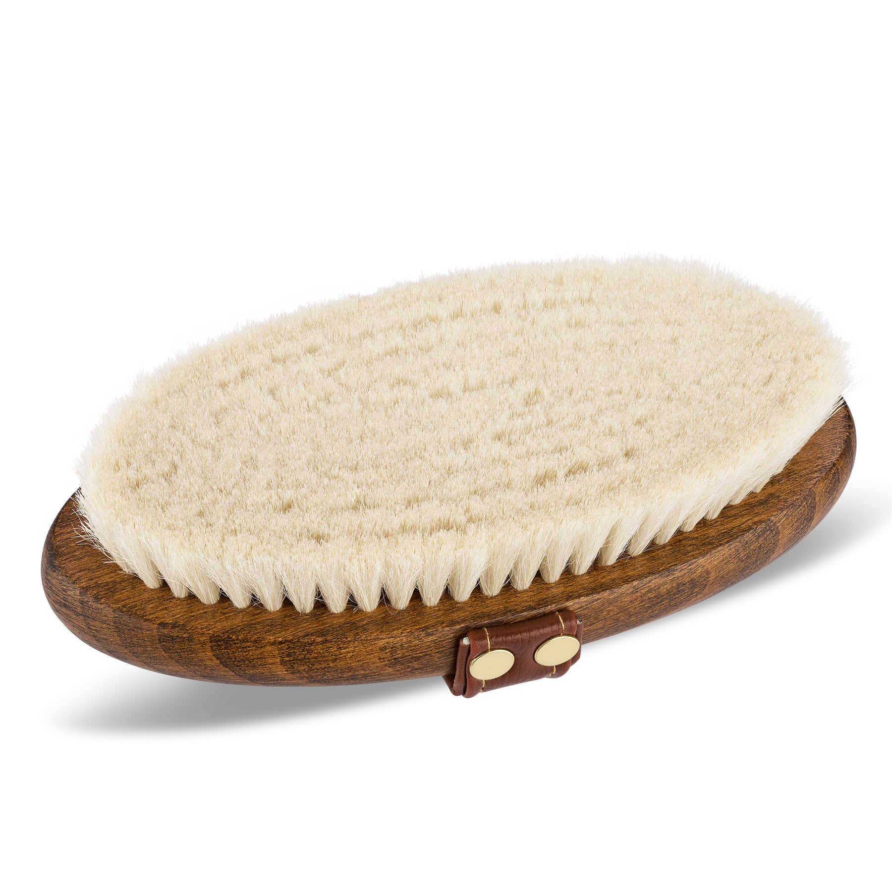 Die ergonomische Handschlaufe aus genageltem, veganem Leder sorgt für sicheren Halt und eine komfortable Handhabung. Hochwertiges Holz, goldene Details und braunes veganes Leder verleihen der Bürste "MO" einen edlen Look, der in jedem Putzkasten heraussticht.