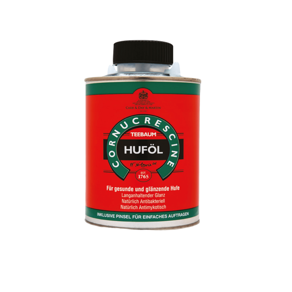Das Carr & Day & Martin Cornucrescine Huföl mit Teebaumöl ist eine moderne Pflegealternative zu klassischen Hufölen. Die hochwertige Rezeptur unterstützt die Gesundheit der Hufe, schützt vor Austrocknung und sorgt für ein dauerhaft glänzendes Finish – unabhängig von der Huffarbe.