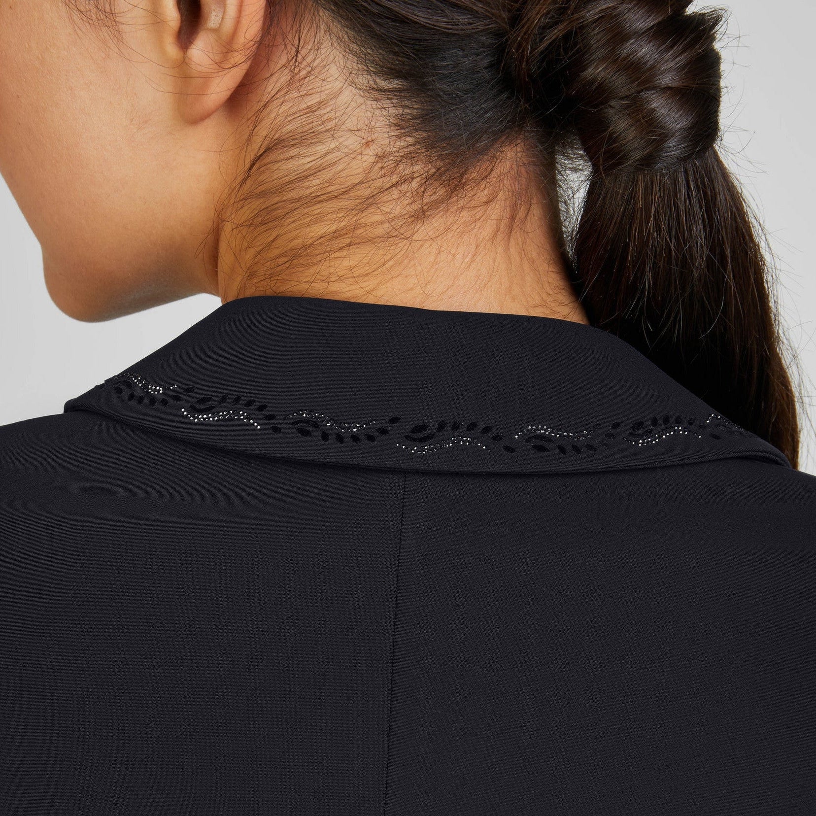 Der körpernahe Schnitt mit schmalem Revers in Spitzfacon und leicht abgerundetem Saum vorne betont eine elegante Silhouette. Dezente Rhinestones-Flock-Applikationen an Kragen, Brusttasche und Rücken setzen edle Akzente. Der schmale Taillengürtel ist vorn mit Rhinestones verziert und sorgt für einen modernen Look. Schwarz glänzende Knöpfe sowie das Profil-Logo in dark silver runden das Gesamtbild stilvoll ab.