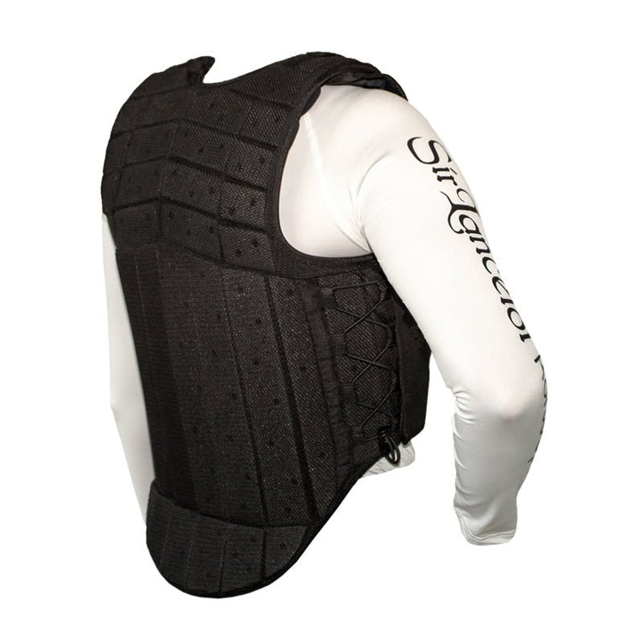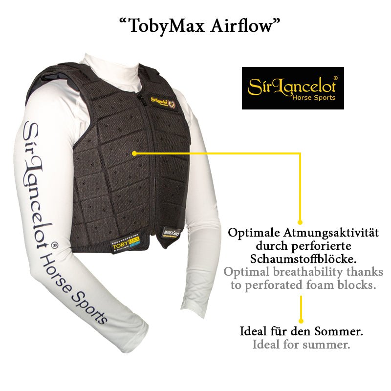 Die Sicherheitsweste "TobyMax" Airflow von Sir Lancelot wurde entwickelt, um Reitern höchste Sicherheit und Komfort zu bieten. Ausgestattet mit perforierten Schaumstoffblöcken für optimale Atmungsaktivität, ist diese Weste ideal für warme Tage geeignet, da sie eine angenehme Luftzirkulation ermöglicht.